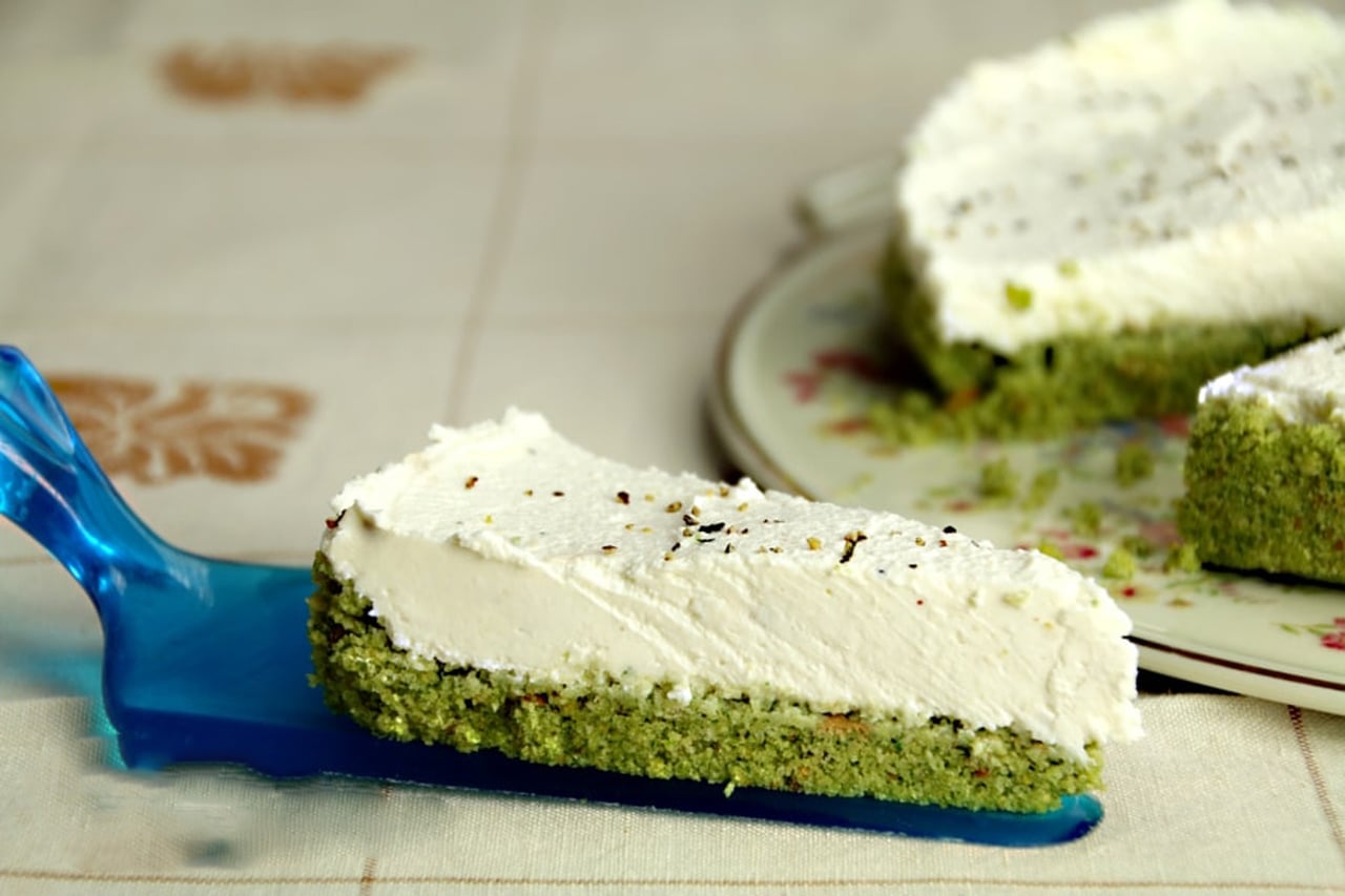 في وعاء نضع الزبد السائل والبسكويت المفتت والفستق الحلبي الأخضر ونقلب جيدا حتى يصبح مثل حبات الرمل.