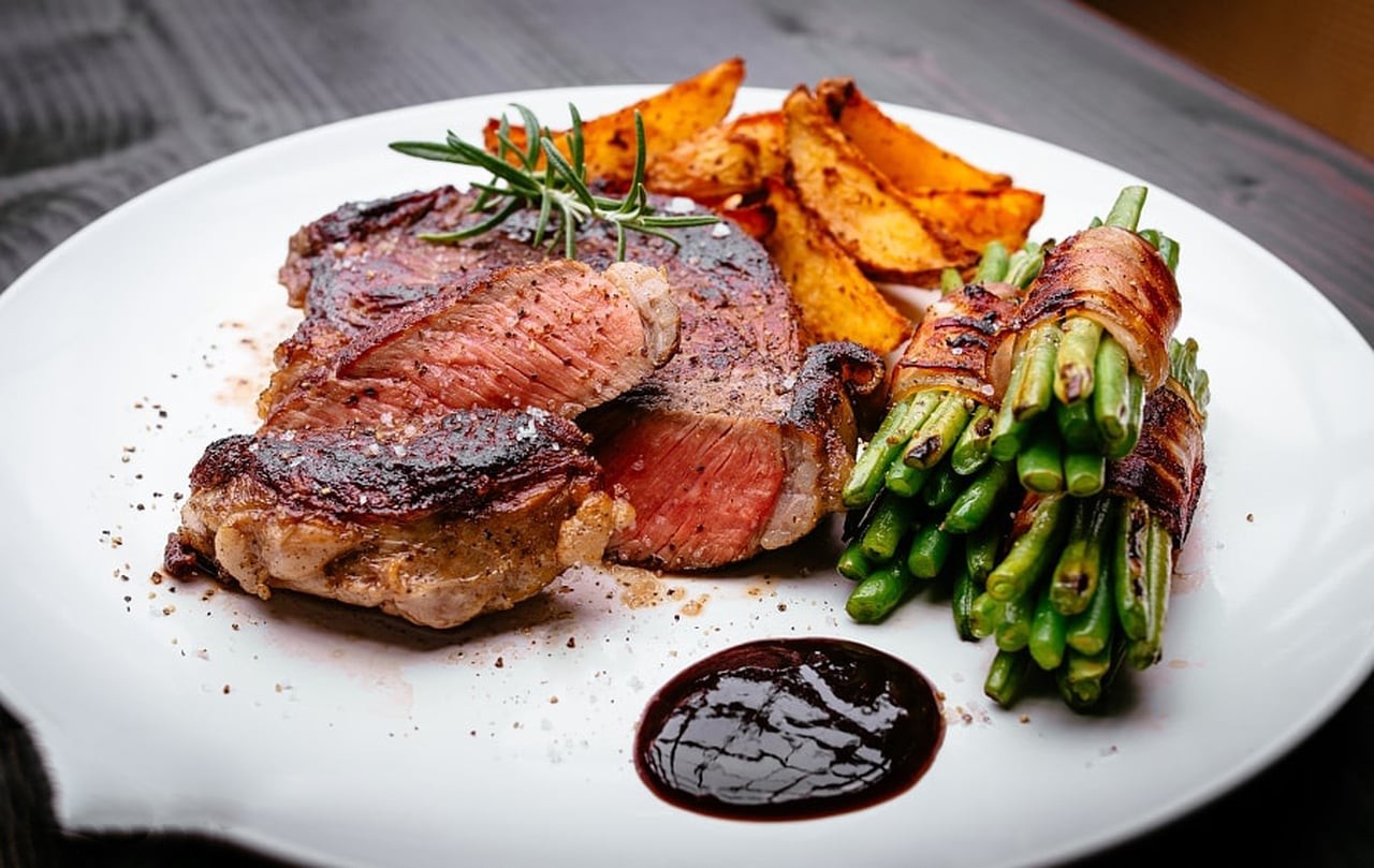 قدمي شرائح اللحم مع الفاصوليا الخضراء والبطاطس المحمرة والأرز الأبيض وبالهنا والشفا.