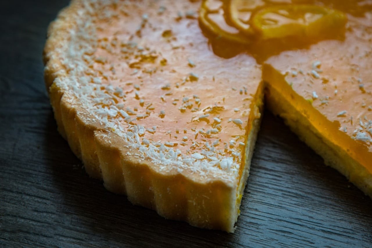 زيني وجه القالب بشرائح الليمون ذهبية اللون، ثم رشي جوز الهند المبشور على الوجه.