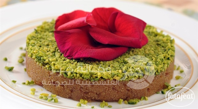 5. توضع الحلاوة في قالب وتُزين بالعسل والفستق على الوجه، وتُقدم بدرجة حرارة الغرفة.