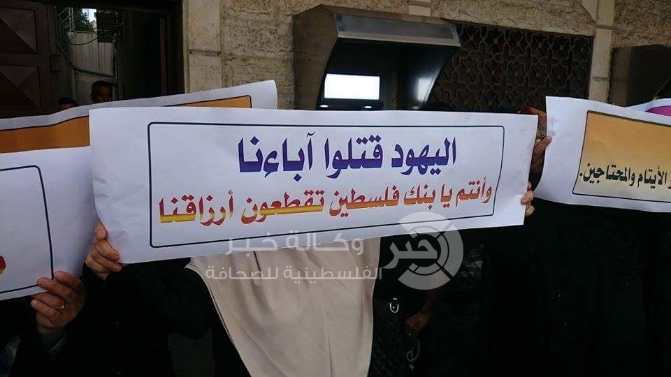 وقال عدد منهم أن بنك فلسطين أغلق حسابات أهالي الشهداء والايتام الامر الذي منع وصول الحوالات المالية لهم من المتبرعين من خارج الاراضي الفلسطينية (..) مشيرين الى ان البنك يشترط حصولهم على موافقة من سلطة النقد الفلسطينية قبل فتح أي حساب لهم.
