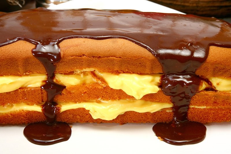 12. اقطعي الكيك من النصف ووزعي حشوة الكريما على إحدى القطع ثم غطيها بالقطعة الأخرى.
