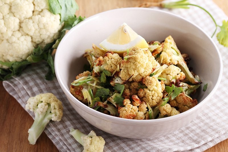 3. تبلي الزهرة بزيت الزيتون والملح والفلفل وضعيها في الصينية المجهزة.