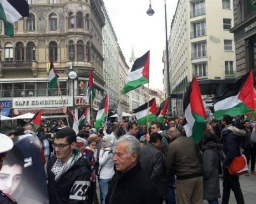 نظم حشد من أبناء الجالية الفلسطينية في النمسا الجمعة، وقفة تضامنية دعمًا للأسرى المضربين عن الطعام في سجون الاحتلال الإسرائيلي، ولمناسبة مرور 69 عامًا على النكبة.