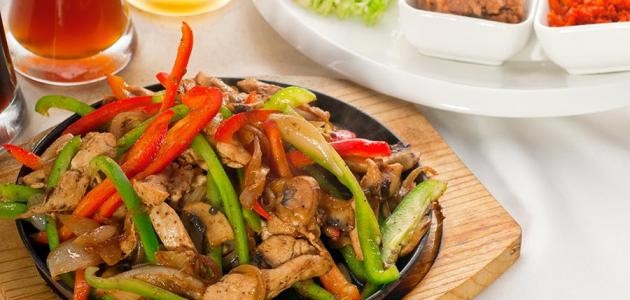 * يشوح الدجاج في طاسة بها زيت على النار ثم يضاف البصل ثم الفلفل الالوان