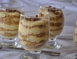 • في طبق زجاجي عميق، ضعي شرائح الكيك ثم الكاسترد ثم شرائح الموز ثم الكراميل.