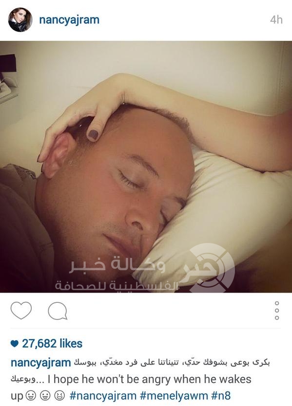 وتأكيداً على عشقها لزوجها، نشرت عجرم صورة لزوجها من داخل غرفة النوم يظهر فيها نائماً وجاء في تعليق الفنانة اللبنانية عليها: "بكرى بوعى بشوفك حدّي، تنيناتنا على فرد مخدّي، ببوسك وبوعيك" " I hope he won't be angry when he wakes up".
