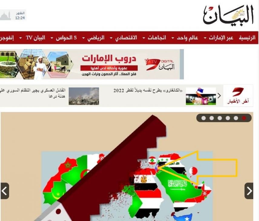 وأشارت المصادر، إلى أن الخريطة، تأتي ضمن ملف أعدته الصحيفة لمهاجمة السياسات القطرية؛ حيث استبدلت العلم القطري بمنشار يقطرُ دمًا ويقطع أوصال الوطن العربي.