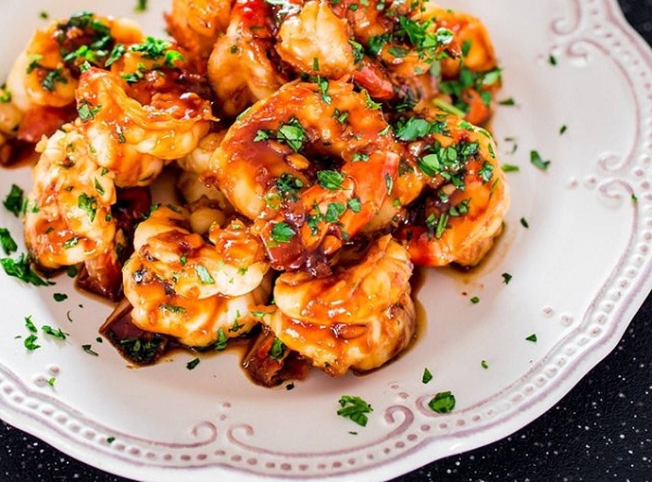 يوضع الروبيان في وعاء عميق ومعه عصير الليمون والبصل المفري وصلصة الصويا والفلفل الحار والبهارات والزنجبيل مع التقليب بخفة بملعقة خشب للتتبيل.
