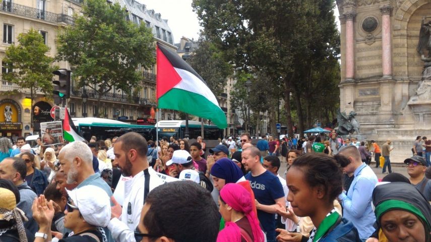 تظاهر عدد من العرب والفرنسيين وسط العاصمة الفرنسية باريس نصرة ودعما للأقصى وتنديدا بالتصعيد الإسرائيلي الأخير في القدس، ورفع المتظاهرون شعارات تحيي صمود الفلسطينيين في القدس ومقاومتهم للاحتلال.