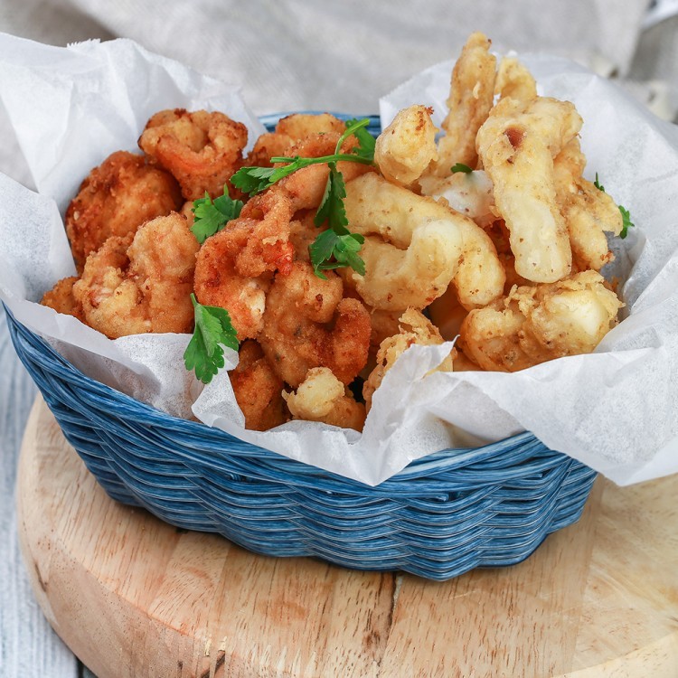 3. لقلي الـ"كلمار": تغمّس كلّ حبة منه في البيض، فالدقيق، وتُقلى مباشرة في زيت ساخن حتى تصبح شقراء اللون.