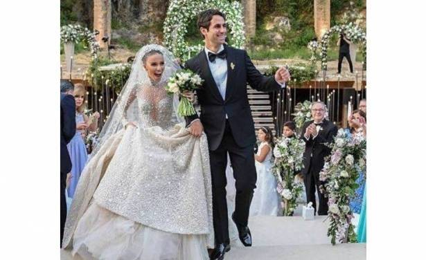 وكانت العروس قد أبهرت الحضور ووسائل الإعلام ورواد مواقع التواصل الاجتماعي بفستانها الأبيض الأسطوري، الذي حمل توقيع المصمم اللبناني العالمي "زهير مراد"، الذي كان أول من نشر صورة من حفل الزفاف مهنئاً العروس التي وصفها بالأميرة قائلاً لها: " لقد خطفتِ أنفاسنا" كتعبير عن إعجابه ومفاجأته بطلّتها الباهرة.