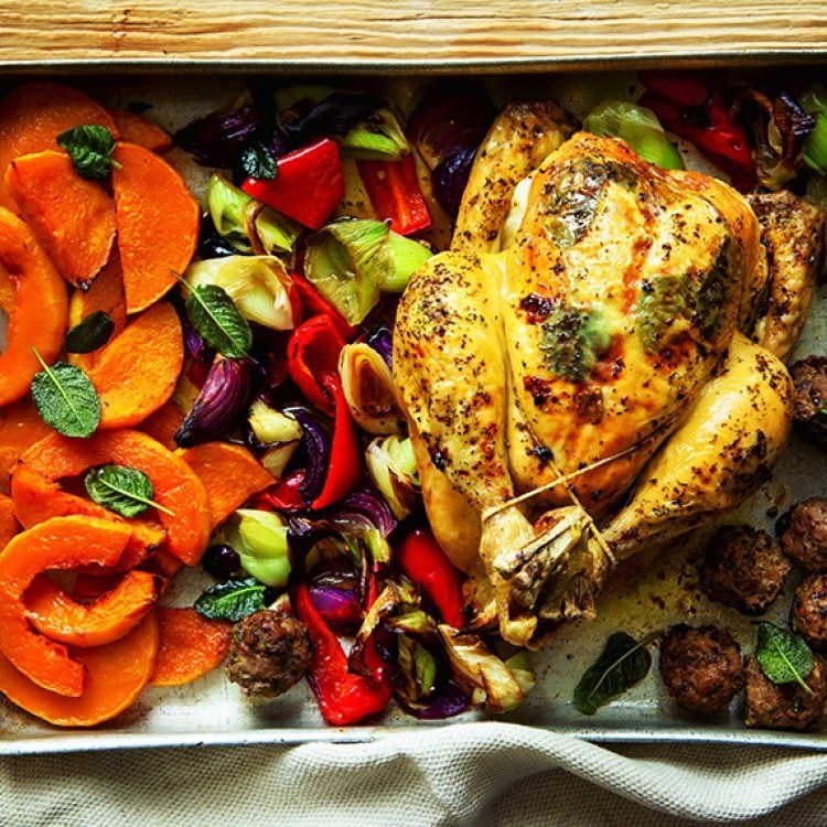 7. تُخرج الدجاجة من الفرن، ويُنزع ورق الأولمنيوم عنها، مع صبّ السوائل الناتجة عن طهوها عليها. وفي الصينيّة عينها، وإلى جانب الدجاجة، تُضاف الخضراوات المجهّزة (الكرّاث والفلفل الحارّ والبصل الأحمر والقرع العسلي). وتُملّح وتُبهّر، ويُصبّ زيت الزيتون عليها. وتُدخل الصينيّة مُجدّداً إلى الفرن، وذلك لثلاثين دقيقة. ثمّ، تُخرج الصينيّة لتقليب الخضراوات، مع توزيع أوراق المريميّة. وتُطهى الصينيّة مُجدّدًا لخمس عشر دقائق، مع إضافة كرات اللحم إليها، وذلك حتى ملاحظة أن السوائل ترشح من الدجاجة، وأن لون الخضراوات تحوّل إلى البنّي.