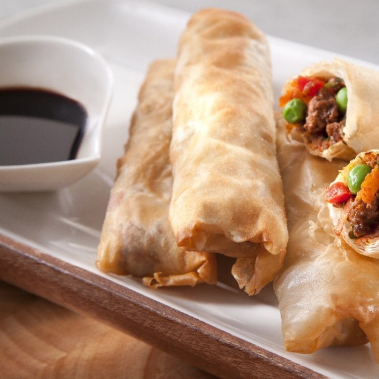 قدمي اللفائف ساخنة في طبق التقديم، مع صلصة الطماطم الحارة، أو صلصة الصويا.
