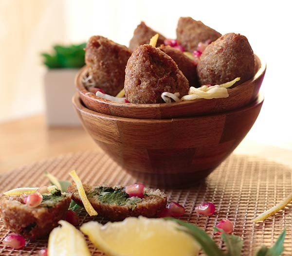 4. تُشكل الكبة على هيئة كرات متوسطة الحجم وتٌحشى بمقدار من السبانخ ثم شريحة لوز وبرش حامض وتقفل الأطراف جيدا. وهكذا حتى انتهاء الكمية ثم تُقلى في زيت ساخن غزير.
