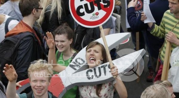 تظاهر آلاف الأشخاص، في شوارع لندن، احتجاجا على سياسة «التقشف» التي تعتمدها حكومة المحافظين برئاسة ديفيد كاميرون، الذي يواجه أول تحرك شعبي منذ فوزه في الانتخابات، في السابع من مايو (أيار).