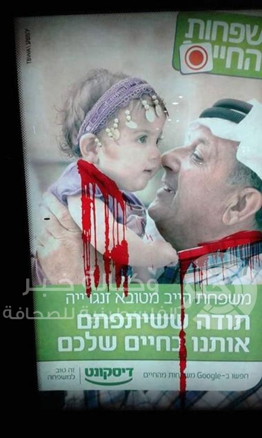 كتب موقع "واللا" أن "مجهولين" قاموا برسم خطوط بلون الدم على رقبة أب عربي وعلى رقبة الطفلة التي يحملها، في الصورة الظاهرة على لافتة تجارية لبنك ديسكونت. وقد شاهدت مواطنة المدينة دوريت ابراموفيتش هذا المشهد المفزع، فالتقطت صورة للافتة ونشرتها على الفيسبوك. وخلال فترة وجيزة حظيت الصورة بانتشار واسع وأثارت تعقيبات غاضبة على الشبكة.