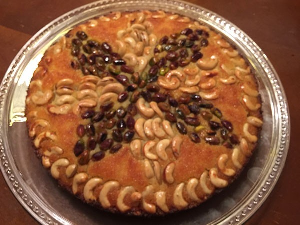 4. تخبز في الفرن على حراره ١٨٠ مئوية ويحمر الوجه من فوق وبعد إخراجها من الفرن نقوم بخلط السمنة مع القطر الساخن ونسكب القطر تدريجيا على الصينية وتترك لمدة ساعتين ثم تقدم.
