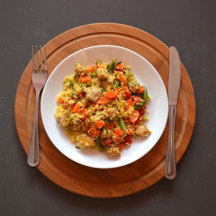 6. اسكبي الدجاج مع الكسكس في طبق التقديم وزيني باللوز وقدميه ساخناً.