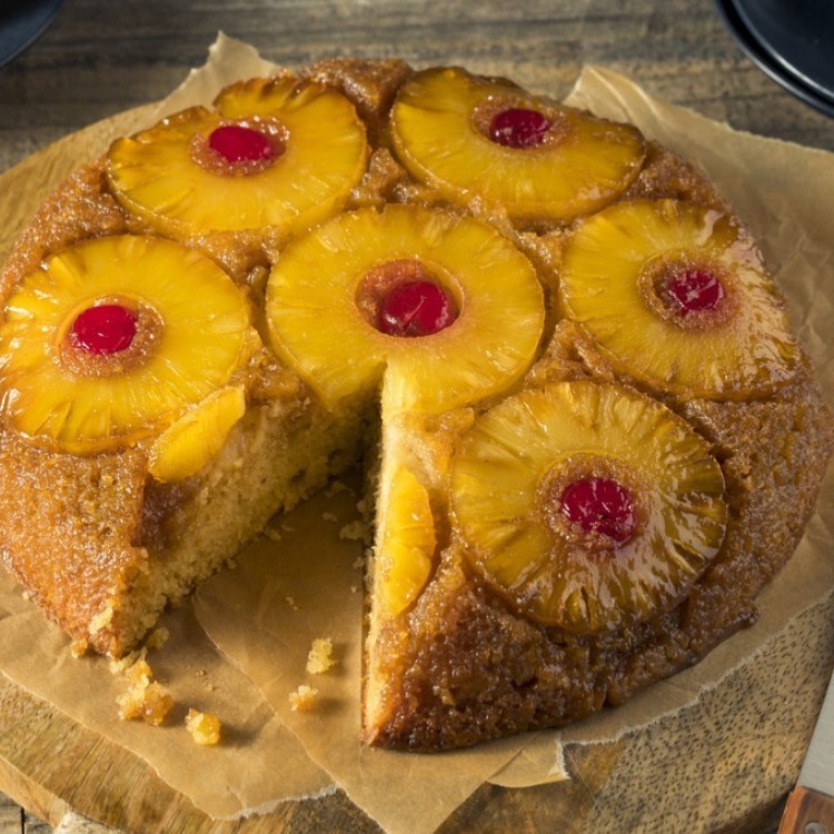 8. ثمّ نقوم بقلب قالب الكيك بهدوء، وإذا واجهنا صعوبة بقلبه نقوم بوضع القالب على النار دون أن يلامس النار لثوانٍ معدودة فقط ثمّ نحاول قلبه حتّى تصبح شرائح الأناناس على السطح.