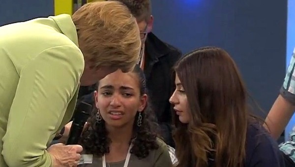 وأضافت ميركل محدثة الفتاة “وكما تعرفين هناك آلاف الأشخاص في مخيمات اللاجئين الفلسطينيين بلبنان، فإن قلنا يمكنكم جميعا القدوم إلى هنا .. لن ننجح بذلك، وسيكون هناك معضلة، كما أنه يتوجب على بعض اللاجئين العودة من حيث أتوا. وعند هذه النقطة بكت الفتاة، الأمر الذي اضطر ميركل إلى قطع كلمتها والتوجه إليها والتمسيد على رأسها ومواساتها، قائلة لها “آه.. لقد أحسنت”، ليتدخل مدير اللقاء قائل “سيدتي المستشارة هذا لا يتعلق بتقديم الأمر بشكل جيد، إنه وضع صعب”، لترد ميركل بالقول “وأنا أعرف أن ذلك أمر صعب”.