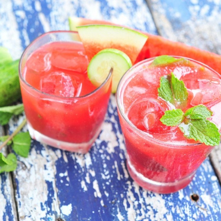 1. ضعي البطيخ والخيار والسكر وعصير الليمون في الخلاط الكهربائي.