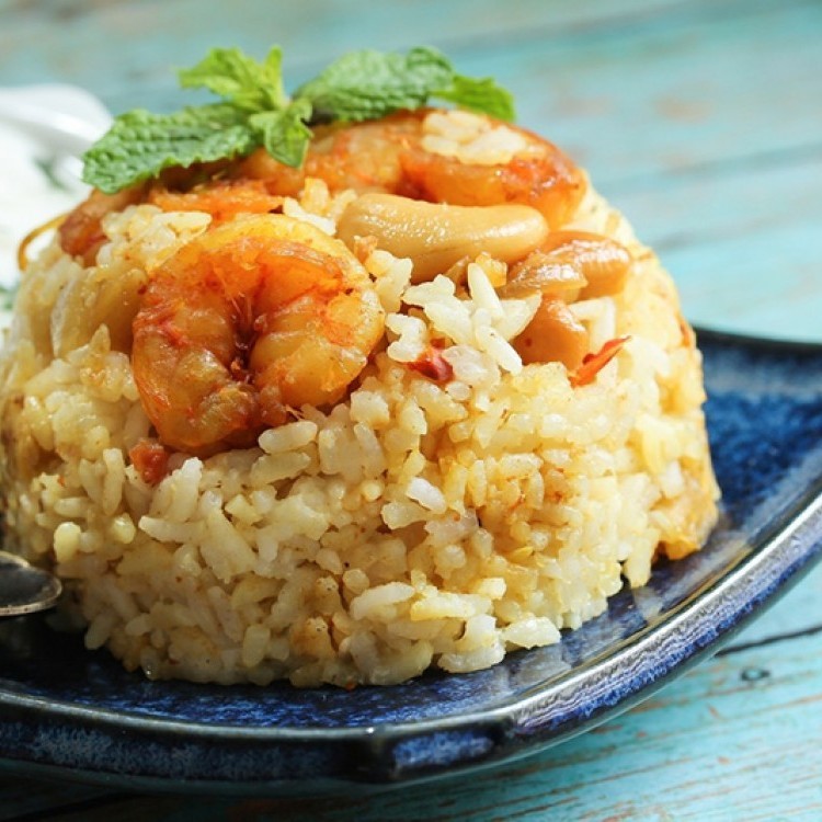 4. أضيفي الأرز للقدر والماء ومكعبات المرق والروبيان المشوح واتركي المزيج على النار حتى يغلي ثم خففي النار واتركيه حتى ينضج الأرز تماما.