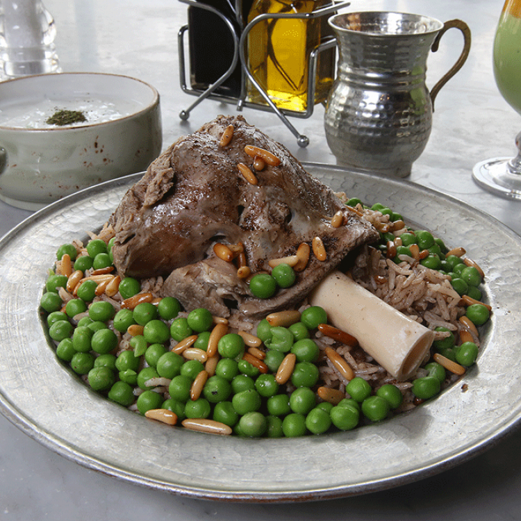 5. طريقة التقديم: يُسكب الأرز في طبق التقديم، تعلوه قطعة اللحم المسلوقة والبازلاء. ويزيَّن الطبق بالصنوبر المقلي. ويُقدَّم مع اللبن المضاف فرم الخيار إليه.