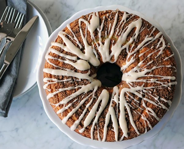 6. بملعقة يوضع نصف الخليط في القالب ويوزع بسكين. يرش نصف كمية الستريوسل ويوضع بقية الخليط في القالب، يرش ما تبقى من الستريوسل على الوجه. تخبز لمدة 40-50 دقيقة، حتى يخرج عود أسنان منها نظيفا.