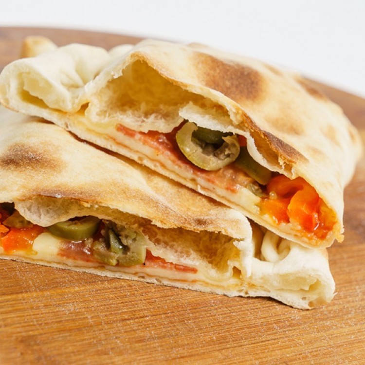 4. وزعي صوص البيتزا على كل دائرة ثم السلامي والزيتون والجبنة وأغلقي العجين على شكل نصف دائرة مع الحرص على إغلاق أطراف العجين بشكل جيد.