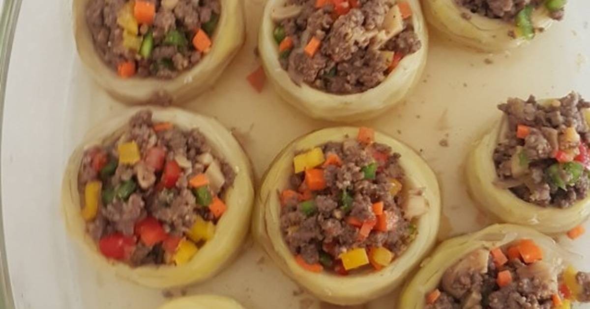 * يحشى الخليط في الخرشوف ثم يضاف الجبن على الوجه ثم يوضع في الفرن حتى تمام النضج