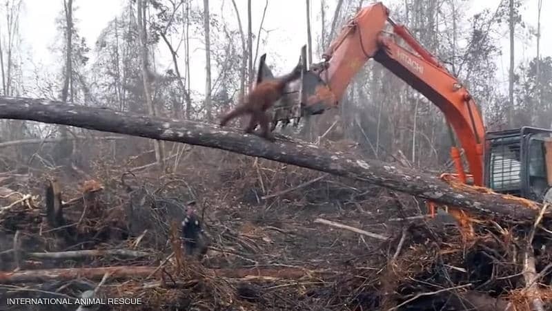 ونشرت صحيفة "صن" البريطانية، مقطعا مصورا سبق أن بثته المنظمة الدولية لإنقاذ الحيوان، يظهر "إنسان الغاب" وهو يحاول حماية موطنه في الغابة أمام الجرافة، حين أمسك بذراعها بكل قوة ليمنعها من تدمير الأشجار.