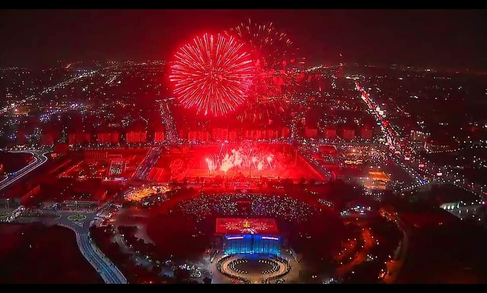وتحولت أرضية ملعب استاد القاهرة، التي احتل منتصفها هرم ضخم توسط هرمين آخرين أصغر حجما، إلى منصة حية للموسيقى والألوان والألعاب النارية، تعبيرا عن الحضارة الفرعونية المصرية والتقاليد الافريقية.