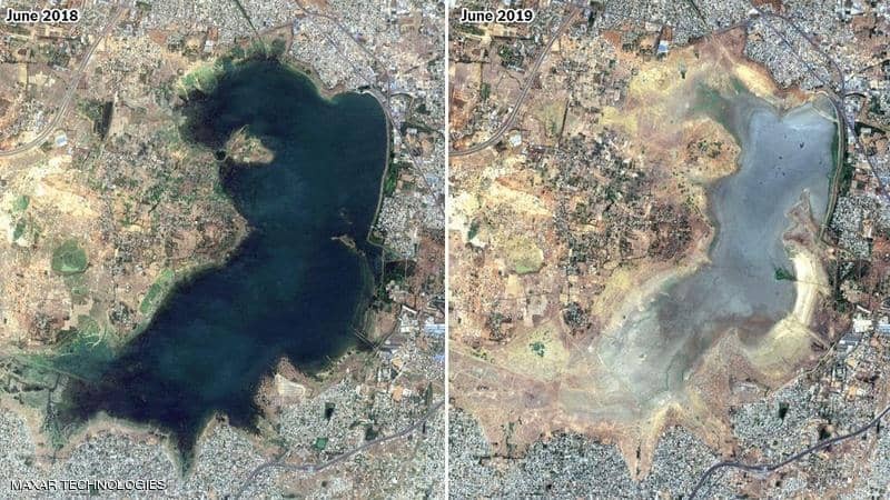 أظهرت صورتان جرى التقاطهما بالأقمار الصناعية بفارق زمني يبلغ عاما واحدا، حقيقة مرعبة في مدينة شيناي الهندية المكتظة بالسكان، وهي أن الماء صار على وشك النفاد، مما ينذر بـ"كارثة كبرى" حسب خبراء.