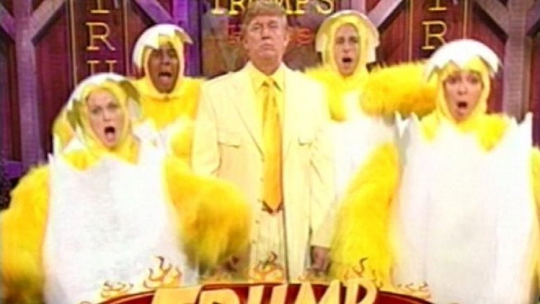 وظهر ترامب في الفيديو الذي يعود لعام 2004 خلال البرنامج التلفزيوني "ساترداي نايت لايف"، وهو يرتدي بذلة صفراء اللون، محاطا بفرقة راقصة ترتدي ملابس شبيهة بشكل الصيصان.