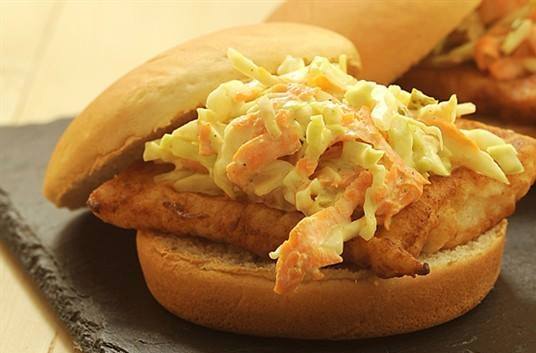 يوضع الفيليه فوق الجزء السفلي من الخبز ثم توضع سلطة الكول سلو على الوجه
