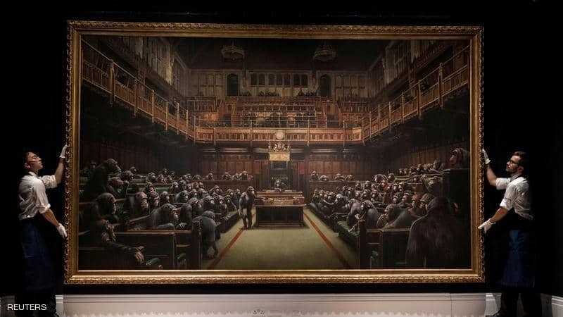 قالت دار سوذبي للمزادات، إن لوحة ضخمة للرسام بانكسي تصور قردة تجلس مكان النواب في البرلمان البريطاني بيعت بأكثر من 12 مليون دولار الخميس وهو مبلغ قياسي في مزاد لعمل للفنان البريطاني مجهول الهوية.