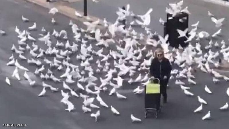 تداول مستخدمو مواقع التواصل الاجتماعي في إسبانيا، مقطع فيديو طريفاً لسيدة عجوز تلاحقها المئات من طيور الحمام الأبيض الجائعة.
