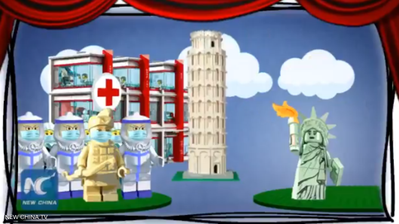 وفي فيلم الرسوم المتحركة الذي نشرته وكالة أنباء الصين الجديدة (شينخوا) ينفتح ستار أحمر ليكشف عن منصة عليها رموز شبيهة بالمكعبات البلاستيكية، على هيئة محارب من جيش التيراكوتا يرتدي كمامة، وتمثال الحرية.