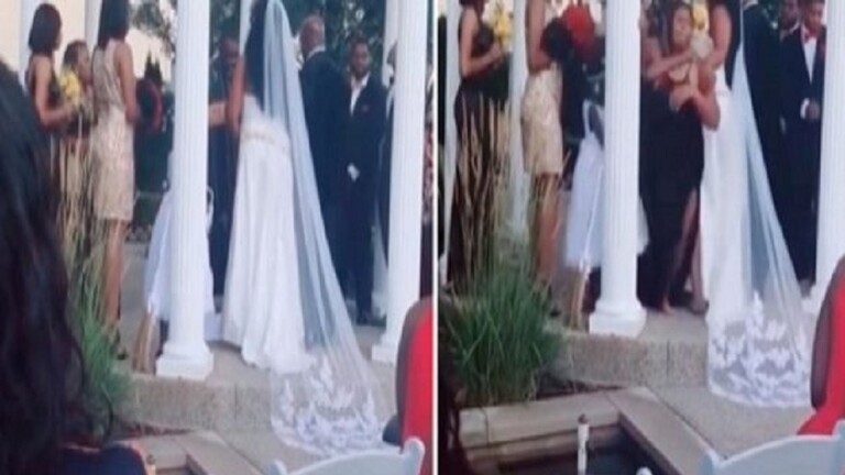 اقتحمت امرأة أمريكية حامل حفل زفاف في الهواء الطلق، وادعت بأن العريس عشيقها ووالد طفلها الذي ينمو في أحشائها، لكن الأخير أشاح بوجهه عنها وتجاهلها وأكمل عرسه دون اكتراث لادعائها.