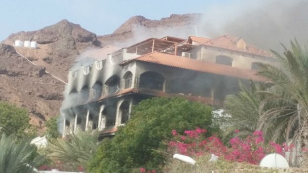 وشوهدت أعمدة الدخان تتصاعد من فندق "القصر" الذي يقيم فيه بحاح وأعضاء حكومته منذ عودتهم التدريجية إلى عدن بعد طرد الحوثيين من المدينة.