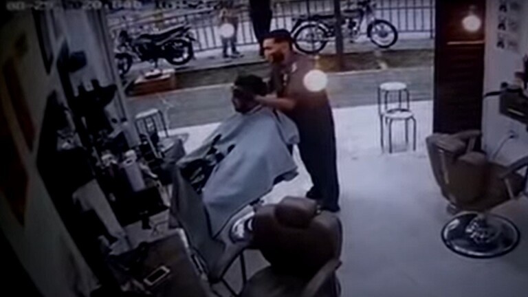 ووفقا للفيديو المتداول، كان الشاب على وشك إنهاء جلسة الحلاقة، ليقتحم المجرم الصالون ويطلق النار ويفر هاربا على دراجة نارية، وسط دهشة وصدمة الموجودين.