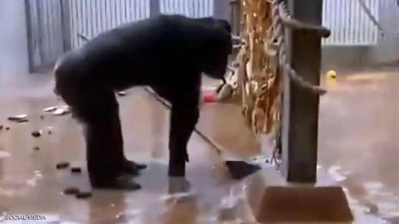 في لقطات طريفة حظيت بآلاف المشاهدات على مواقع التواصل الاجتماعي، انهمك شمبانزي في تنظيف قفصه باستخدام مكنسة وجدها بالداخل.