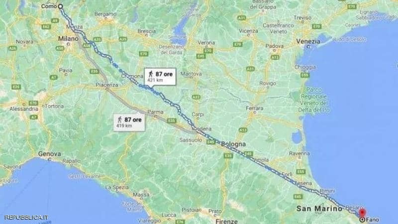 إلا أن الرجل أوقف عن طريق الشرطة في نهاية رحلته، حيث تم تغريمه 400 يورو بسبب سيره في الشارع في الثانية صباحا، في خرق لقواعد الحجر الصحي في إيطاليا.