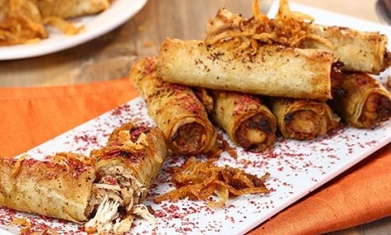4. يوضع خليط الدجاج على خبز الصاج وتُكون منه لفائف، ثم يُضاف قليلاً من زيت الزيتون على سطع اللفائف.