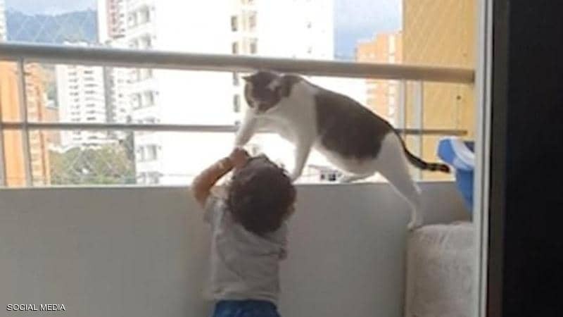 أظهر مقطع فيديو تم تداوله على مواقع التواصل الاجتماعي، قطة تحاول منع طفل من تسلق حاجز الشرفة في منزله.