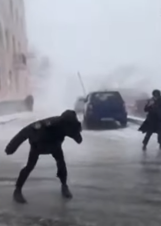 وسط الأجواء الشتوية شديدة البرودة، أظهرت لقطات فيديو مشاهد طريفة لبعض السكان في مدينة فلاديفوستوك الروسية يحاولون مقاومة قوة تيار الهواء الذى يحركهم في شوارع المدينة، وظهروا وهم يكافحون الهواء للحفاظ على توازنهم أثناء سيرهم على الأرض، فيما كانت الرياح العاتية المصاحبة للعاصفة الجليدية تدفعهم للانزلاق باتجاهات مختلفة.