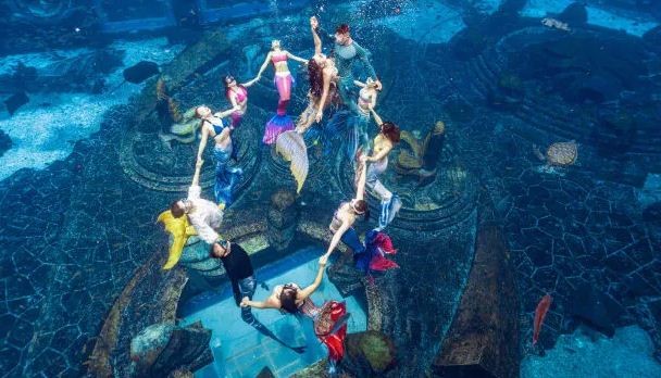 منتجع "أتلانتس سانيا" في الصين واحد من أشهر المنتجعات العالمية التي تضم حوالي 86 ألف كائن بحري من أكثر من 280 نوعا من الكائنات البحرية، ويعتبر المنتجع الشهير أحد المزارات التي تلقى رواجا فى الصين، وادخل المنتجع فكرة جديدة تزيد من إقبال الجماهير، حيث استقبل الحوض المائي الضخم فى منتجع أتلانتس سانيا، 100 من الغواصات التى ارتدت أزياء حوريات البحر، وترفرف بأذيالها أثناء الغوص في الماء، كأنها كائنات بحرية.