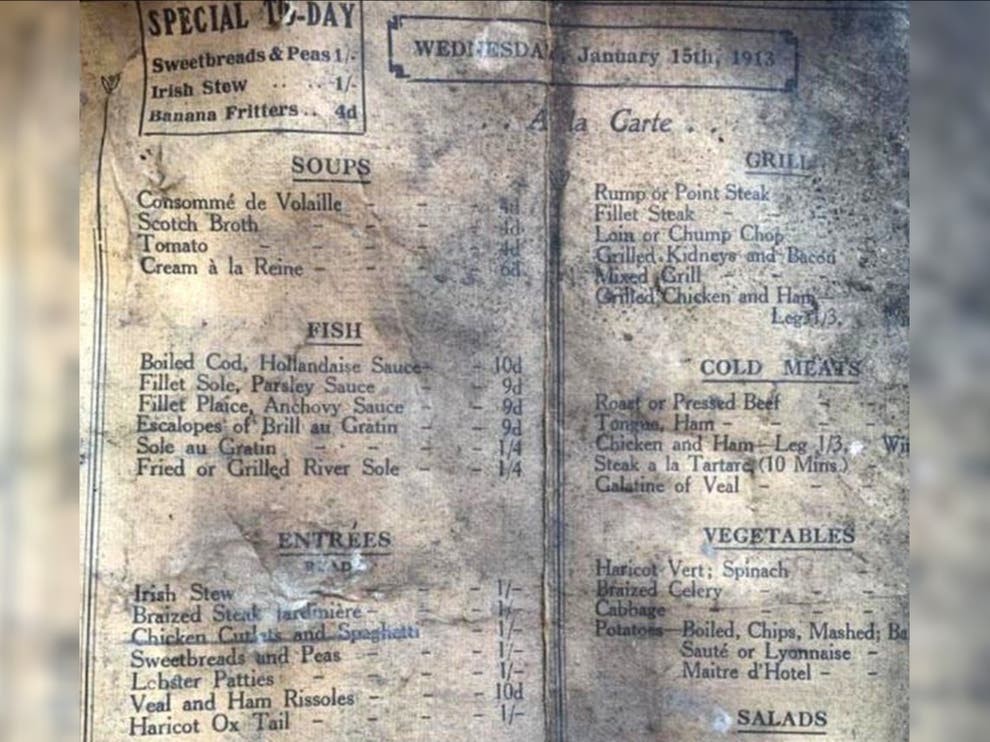 قائمة الطعام المكتشفة، تعود إلى تاريخ الأربعاء 15 يناير 1913، وتم إدراج سلطة جراد البحر، وجيلاتين لحم العجل، ضمن عروضها، وتوضح القائمة أن المطعم المصمم على طراز الحانة الصغيرة والذي كان يشغل الموقع في ذلك الوقت، ويُطلق عليه اسم Yamen Cafe ، يعد العملاء بتقديم مجموعة مختارة من "المرطبات ووجبات الغداء وشاي العصر".