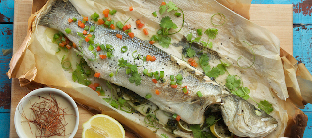 يدلك السمك بالزيت والملح ويوضع السمك فوق البطاطا ويشوى في فرن ساخن مدة 20 دقيقة حتى يسمر الوجه قليلاً ويبدأ الجلد بالانفصال عن اللحم.